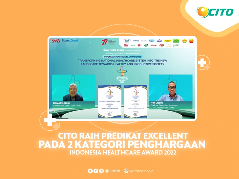 Indonesia Healthcare Award 2022 yang dilaksanakan pada Senin (22/8/2022) lalu, CITO mendapatkan dua penghargaan dengan predikat excellent untuk kategori Laboratorium Klinik & Klinik Tes COVID. Penghargaan ini dilaksanakan secara virtual dan disiarkan langsung melalui Channel YouTube SWA Media. Pada acara yang dipimpin oleh CEO dari SWA Media ini, juga turut mengundang Menteri Kesehatan Ir. Budi Gunadi Sadikin, CHFC, CLU untuk memberikan keynote speech. Keberhasilan dalam mendapatkan predikat excellent untuk kategori Laboratorium Klinik dan Klinik Tes COVID ini disambut baik dan syukur oleh CITO yang disampaikan melalui Direktur Bisnis & Keuangan yaitu Norcholis, S.E.