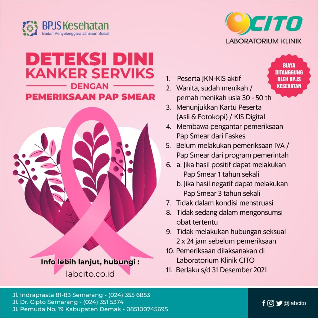 Oleh karena itu, BPJS Kesehatan kembali memberikan layanan pemeriksaan pap smear gratis bagi seluruh peserta wanita dengan bekerja sama dengan beberapa mitra kesehatan salah satunya dengan Laboratorium Klinik CITO.